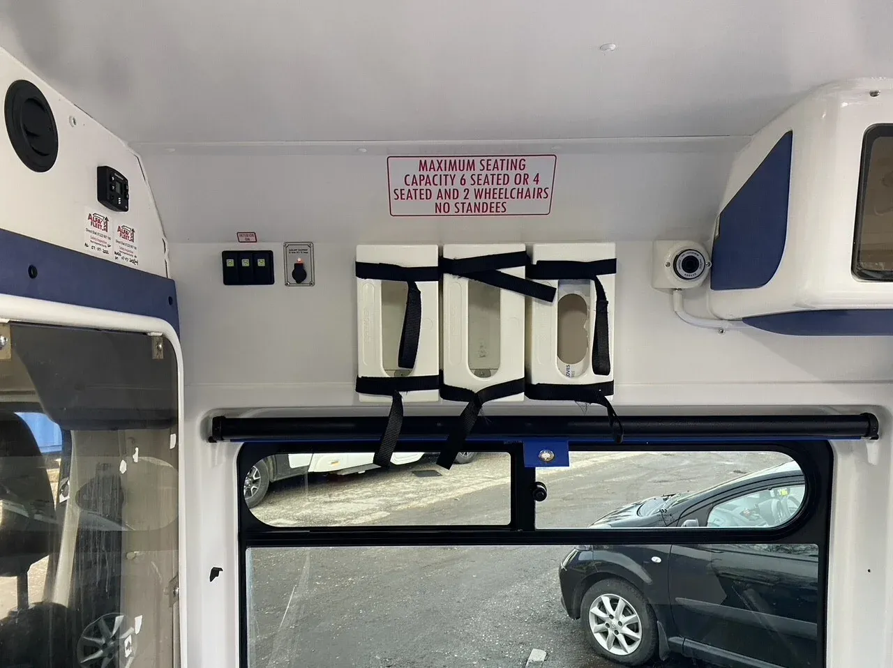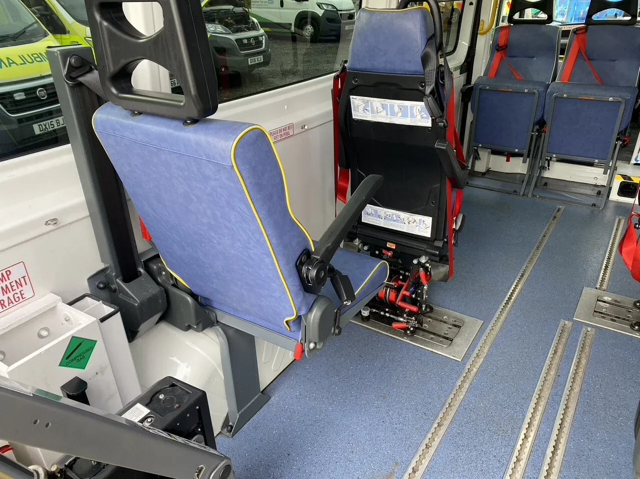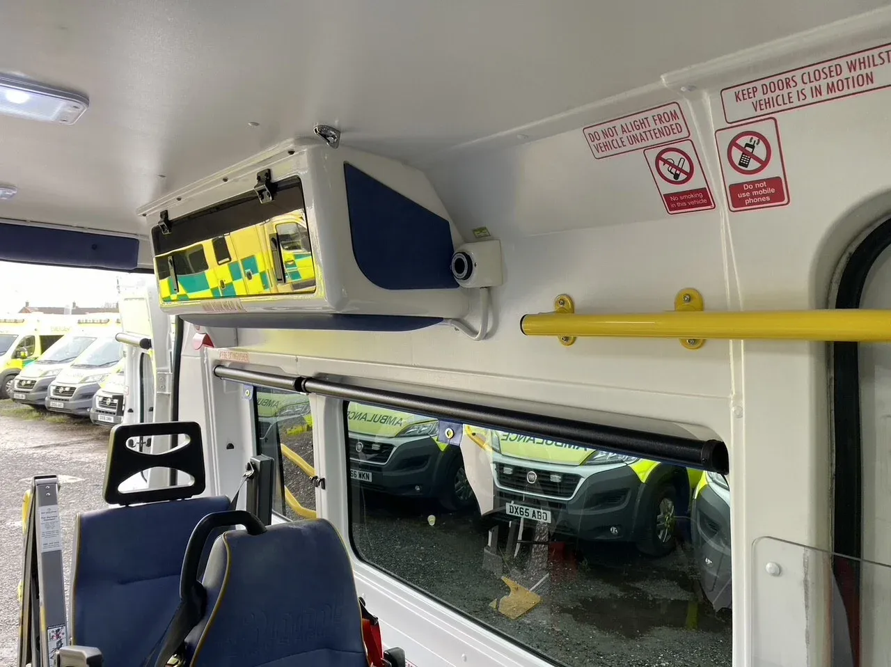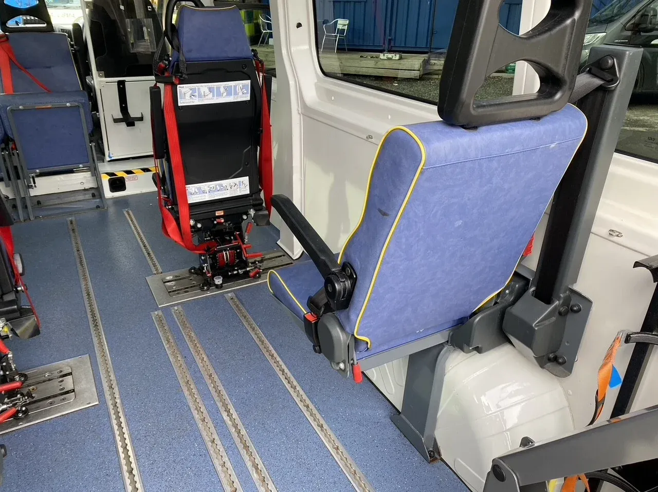 - Unwin wheelchair tracking, six seats in saloon with wipe clean surfaces, window blinds, high visibility grab rails, equipment storage box